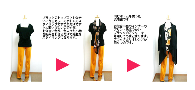 診断を受ける際に、ブラックが似合わないと言われる特にオータムの方、(スプリングの方一部)着ない方がいいと言っているわけではありません。 黒の服は誰もがもっています。全面に配色するよりも効果的な方法があるとお伝えしたいのです。 スタイリング、コーディネートとはどんなパーソナルカラーの方でもJISの標準体型であれば一通り何でも着こなすことができるのです。 理由はJISをもとAR、Y等、基本のトルソーに対してに様々なブランドが商品を作っているからです。 下記のように、黒がトップスに着た場合でもお似合いになるカラーを効果的に配分するのです。 お似合いになるカラーは黒に対して必ず目立って発色するものです。 このようにして黒を使っても、より効果的なスタイリングを含めてご提案し、貴方の美をお約束します。